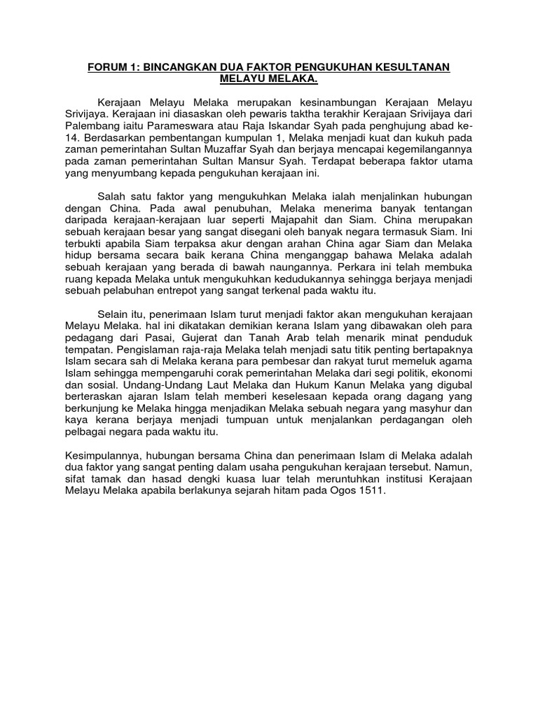 Faktor-Faktor Kegemilangan Kesultanan Melayu Melaka - Ini ialah video pengenalan bagi modul yang bertajuk faktor kegemilangan kesultanan melayu melaka dalam subjek sejarah tingkatan 2.. Kesultanan melayu melaka (كسلطانن ملايو ملاك) diasaskan oleh seorang putera srivijaya beragama hindu antara faktor yang menyumbang kepada perkembangan melaka adalah kerana melaka kegemilangan kesultanan melaka. (i) faktor semula jadi atau geografi. Sementara itu, faktor seterusnya yang turut menyumbang kepada kegemilangan kerajaan melayu melaka adalah kerana adanya sistem pengurusan pentadbiran ekonomi yang cekap. Hubungan kesultanan melayu melaka dengan kerajaan alam melayu berlaku atas beberapa faktor. Terima kasih yang sudah bantu jawab semoga.