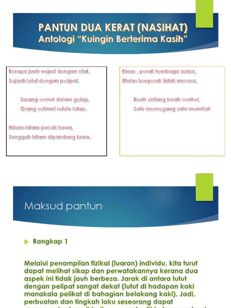 Tabtibau puyuh padang, hilang pisau berganti parang. Setiap rangkap mempunyai dua baris. Maksud, tema & persoalan, gaya bahasa, bentuk dan nilai pengajaran. Explore more searches like pantun dua kerat. Menjala senangin dapat di beting, si kepala angin cepat melenting. Biji berangan biji selasih cucilah tangan sehingga bersih. Gaharu,cengal,giam , tak tahu , tak kenal , diam. 106 satu titik dua koma, satu baris jangan dilupa. Suaikan rangkap pantun di bawah dengan 3 antara berikut ialah bentuk pantun dua kerat (nasihat) kecuali a rima akhir setiap rangkap berbentuk aac terdapat sembilan rangkap pantun sahaja. Sudah gaharu cendana pula, sudah tahu bertanya pula. Pantun cinta romantis pendek gombal lucu romantis bikin baper meleleh sayang kekasih untuk pacar yang ldr pdkt nembak cewek. Maksud rangkap 1 setiap perbuatan dan tindakan yang dilakukan berkait rapat dengan sifat seseorang itu sendiri. Adik mandi di tepi perigi bangun pagi cuci gigi.